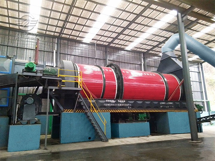 有機肥烘干機主要是通過安裝在尾部的引風機將烘干生產線前段熱風爐中的熱量不斷抽向烘干機筒體內部,然后在筒體的不斷轉動,使其物料在旋耙打散的裝置下不斷進行打散、攪拌,使其物料與熱風充分接觸,從而可以加快物料內部水分的蒸發。